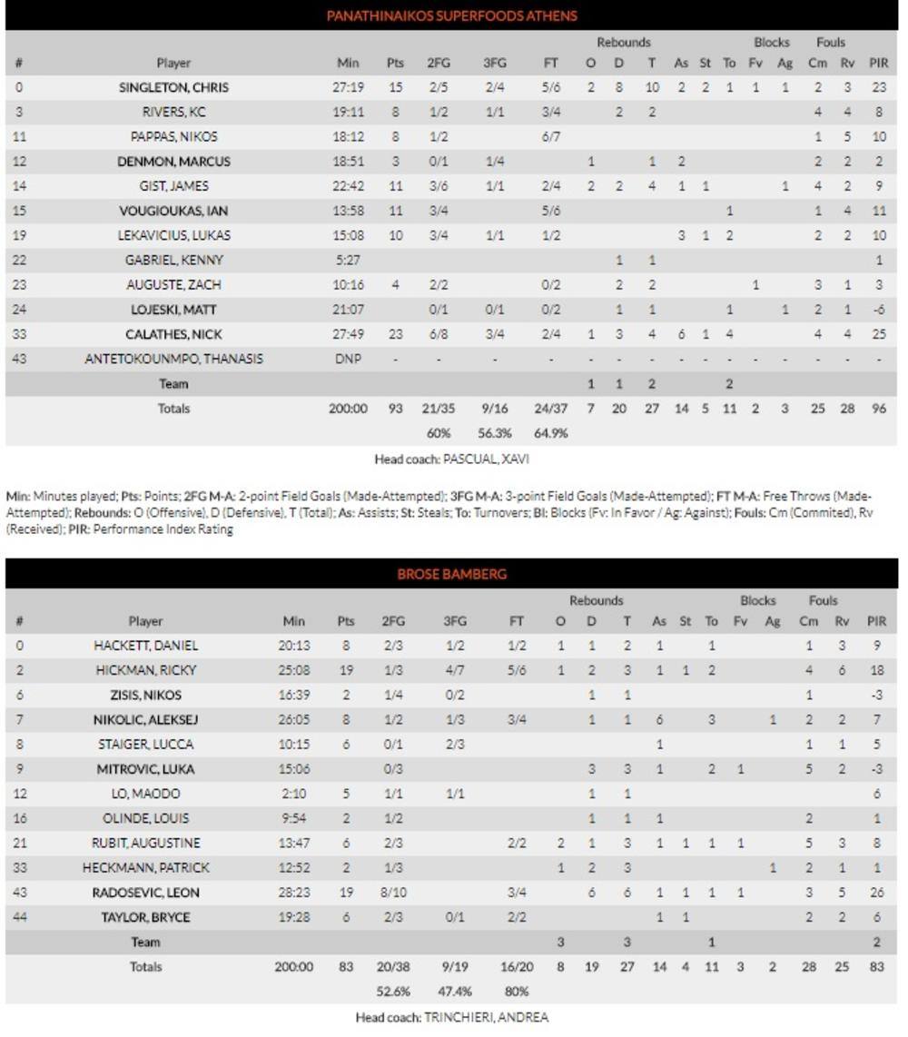U ekipi Bamberga najbolji je bio Riki Hikman sa 19, Luka Mitrović je imao učinak od nula poena, tri skoka i jednu asistenciju. Ekipi iz Grčke je ovo prva pobeda, dok je Bamberg zabeležio drugi poraz.