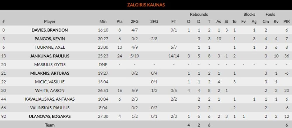 Paulijus Jankunas bio je najefikasniji u ekipi Žalgirisa sa 24 poena i osam skokova, a Aron Vajt dodao je 16 poena uz osam skokova.