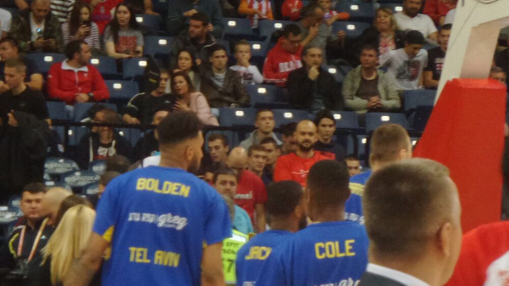 Igrači su pre utakmice, kao što to uvek i biva, izašli na zagrevanje, a u plavom dresu izraelskog kluba na terenu se pojavio i Džona Bolden.