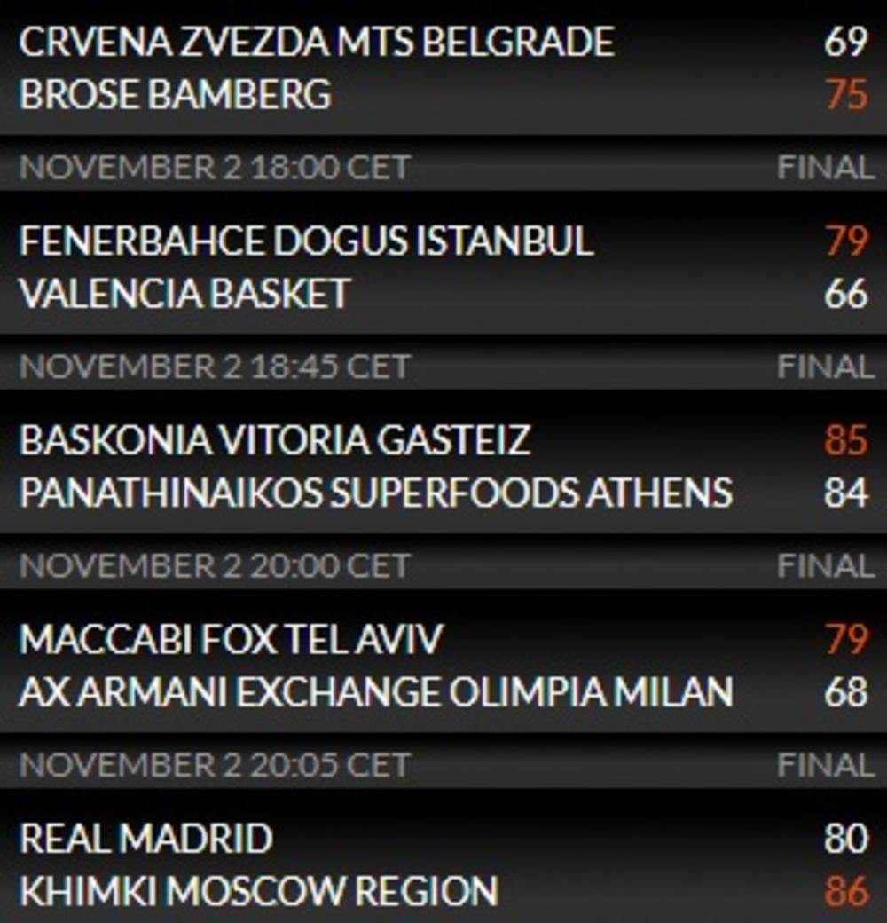 Neizvesno je bilo u Vitoriji, gde je Baskonija dočekala Panatinaikos. Španski sastav je sa novim trenerom Pedrom Martinezom stigao do prvog trijumfa u EL ove sezone, slavili su u uzbudljivoj završnici protiv grčkog šampiona sa 85-84. Gosti su bolje otvorili meč, ali se domaćin konsolidovao brzo, pa je neverovatnom serijom 15-0 stigao do 11 poena prednosti. Ipak "Zeleni" su se probudili krajem prvog kvartala, prekinuli su seriju domaćin i svojom serijom stiglo do zaostatka od svega tri poena. Baski u drugom kvartalu uspevaju da zadrže prednost, opet dolaze do dvocifrenog viška, ali PAO je još jednom bio koncentrisaniji u završnici, te su spustili na samo dva poena razlike pred poluvreme. Polako je PAO uzimao stvari u svoje ruke, došli su do preokreta sredinom treće deonice, a prednost su držali sve do sredine poslednjeg kvartala, kada je domaćin poravano. Nisu izabranici Pedra Martineza uspeli da preokrenu rezultat, držao li su Paskvalovi puleni prednost, a u poslednjim trenucima bilo je veoma neizvesno.