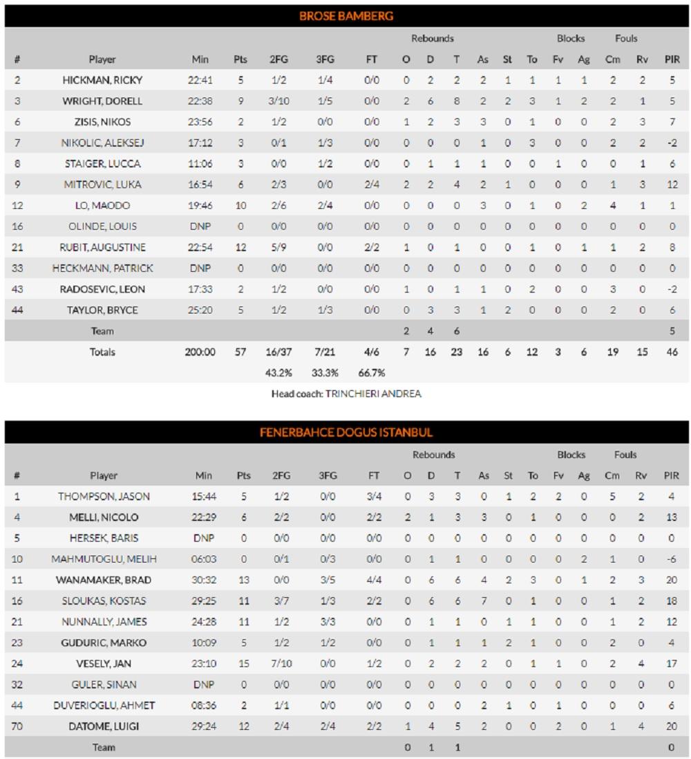 U pobedi ekipe Željka Obradovića, Kostas Slukas je postigao 11 poena uz sedam asistencija, dok je Jan Veseli bio najefikasniji sa 15 poena. Marko Gudurić je dodao pet.