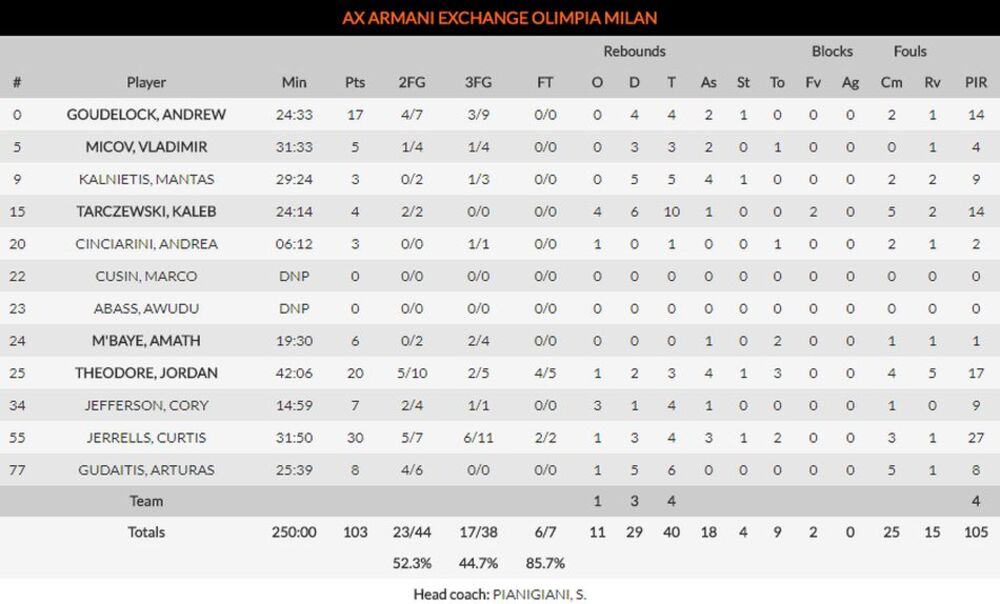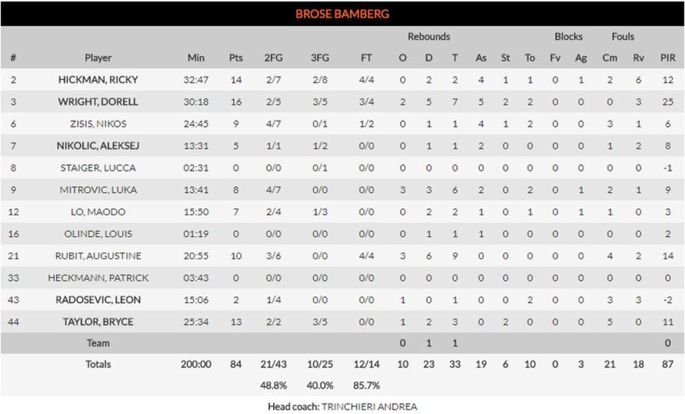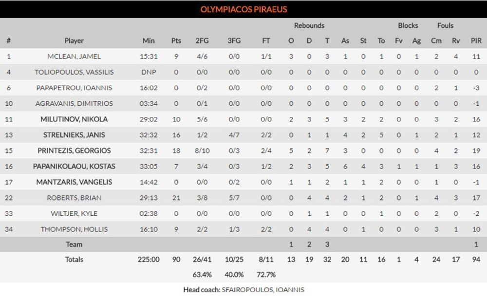 Najefikasniji u pobedničkoj ekipi bio je Brajan Roberts sa 21 poenom uz četiri skoka, a pratio ga je Printezis sa tri manje, kao i Strelnieks sa 16. Nikola Milutinov je upisao 10 poena uz pet skokova.