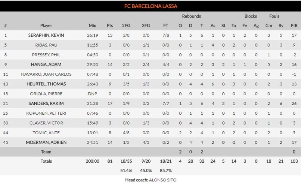 Barselonin glavni čovek na terenu bio je Rakim Sanders sa ubačenih 17 poena, a Adam Hanga i Adrien Moerman po 14.