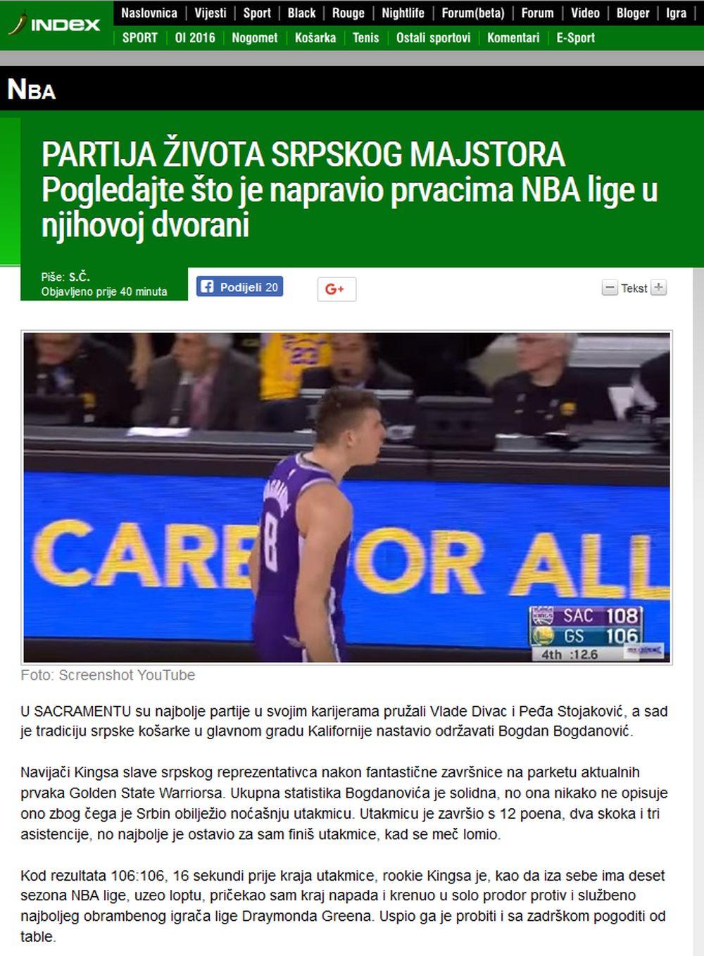 - U Sakramentu su najbolje partije u svojim karijerama pružali Vlade Divac i Peđa Stojaković, a sad je tradiciju srpske košarke u glavnom gradu Kalifornije nastavio održavati Bogdan Bogdanović. Navijači Kingsa slave srpskog reprezentativca nakon fantastične završnice na parketu aktuelnih prvaka Golden Stejt Voriorsa. Ukupna statistika Bogdanovića je solidna, no ona nikako ne opisuje ono zbog čega je Srbin obeležio noćašnju utakmicu. Utakmicu je završio s 12 poena, dva skoka i tri asistencije, no najbolje je ostavio za sam finiš utakmice, kad se meč lomio - navodi se između ostalog u izveštaju "Indexa" pod naslovom "PARTIJA ŽIVOTA SRPSKOG MAJSTORA Pogledajte što je napravio prvacima NBA lige u njihovoj dvorani".