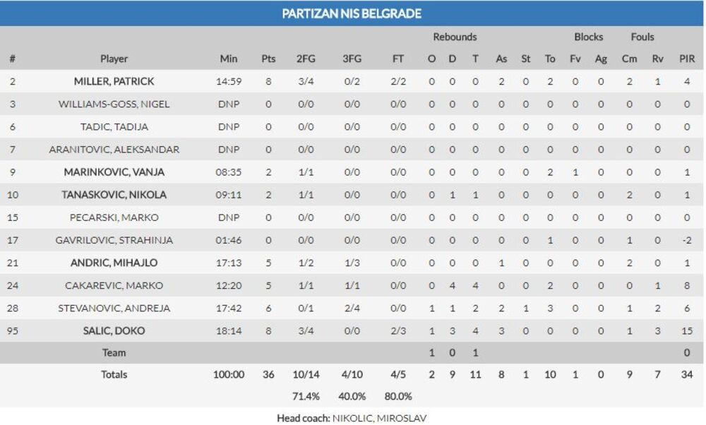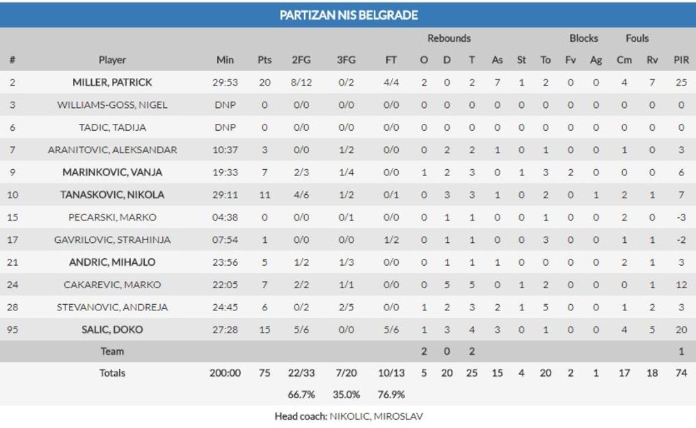 Što se tiče crno-belih, Patrik Miler je postigao 20, Đoko Šalić 15, a Nikola Tanasković 11