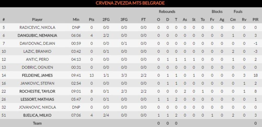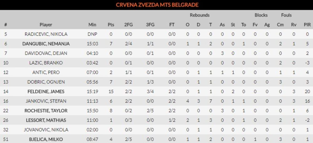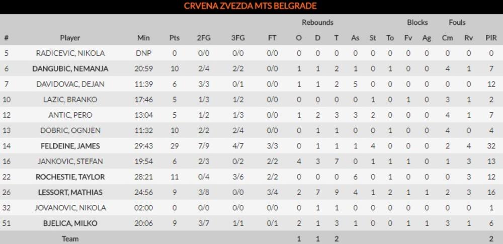 KRAJ PRVE ČETVRTINE - 29:23 vodi Crvena zvezda! Samo četiri igrača upisala su se u listu strelaca. Feldin je postigao 13 poena, Ročesti 8, Bjelica i Dangubić po 4. Na drugoj strani Dragić je ubacio 8 poena.