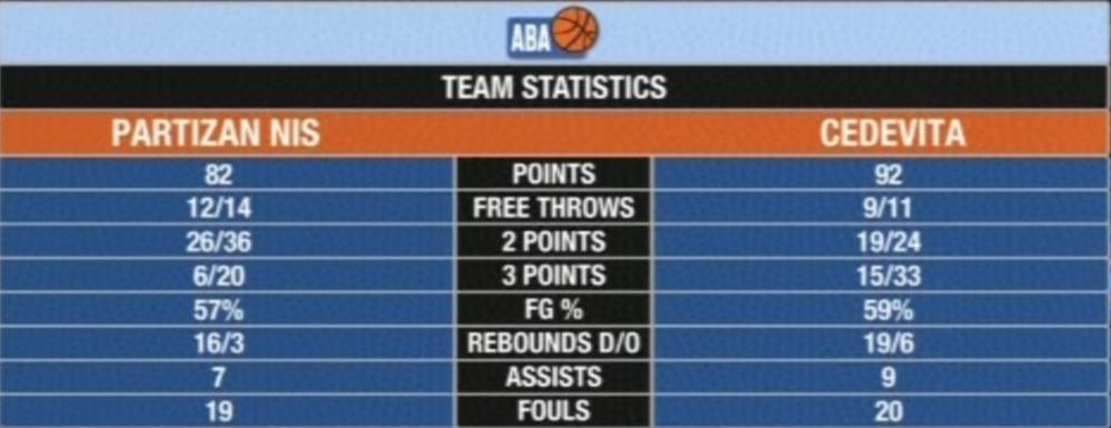 Košarkaši Partizana poraženi su na svom terenu u 11. kolu ABA lige od Cedevite rezultatom 92:82.