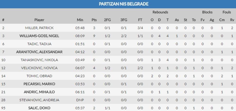 KRAJ PRVE ČETVRTINE: 18:22 - Gotova je prva deonica, Partizan posle početnog vođstva nije iskoristio neke zicere, gosti su to iskoristili i imaju prednost od četiri poena. Vilijams-Gos postigao je 9 poena u domaćem timu.