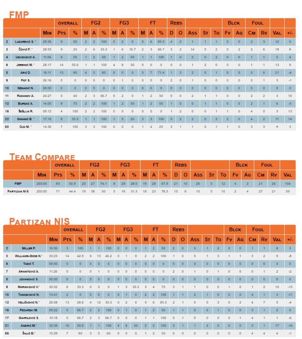 FMP je slomio rivala u poslednjoj deonici. Prvi put su Panteri imali i dvocifrenu prednost, a crno-beli su se vratili serijom od 5:0, što je bio i poslednji trzaj. Filip Čović je imao sjajnih 14 asistencija, a pohvalićemo i mlade lavove Uskokovića i Simanića. Jeremić je postigao 14 trojki. Novica Veličković je imao šut 4/14.
