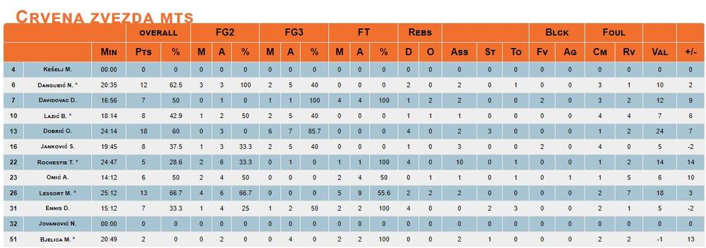 Najefikasniji kod pobednika bio je Dobrić sa 18 poena, šut za 3 6/7, dok ga je pratio Leosr sa 13, odnosno Dangubić sa 12 poena.