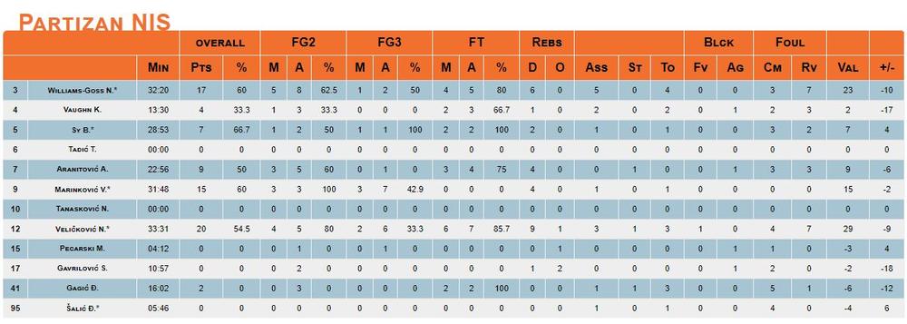 U Partizanu istakli su se Veličković sa dabl-dabl učinkom od 20 poena i 10 skokova, dok je Vilijams Gos dao 17.