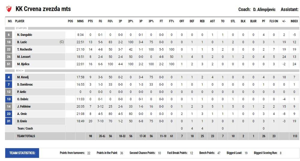 Najefikasniji kod pobednika bio je Enis sa 20 poena, pratio ga je Bjelica sa 16, odnosno Ročesti sa 14 i Lazić sa 13.