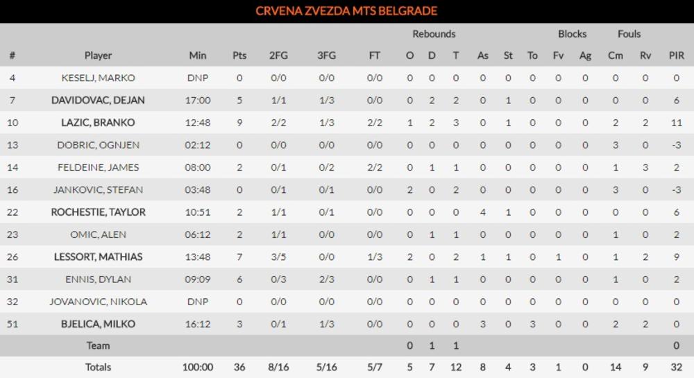 KRAJ PRVOG POLUVREMENA: 46:36 - Velikih +10 za nemački tim posle prvih 20 minuta. Loša druga četvrtina crveno-belih košarkaša, postigli su samo jedan poen i to sa linije slobodnih bacanja u poslednjih 5 minuta prvog dela. Rajt je najefikasniji sa 11 poena, a u Crvenoj zvezdi najviše poena postigao je Lazić - 9