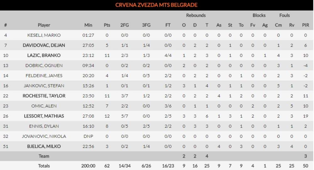 Najefikasniji igrač u domaćoj ekipi bio je Dorel Rajt sa 21 poenom, a pratio ga je Štajger sa 12. U Crvenoj zvezdi su se istakli Lesor sa 12 i Lazić i Ročesti sa po 11.