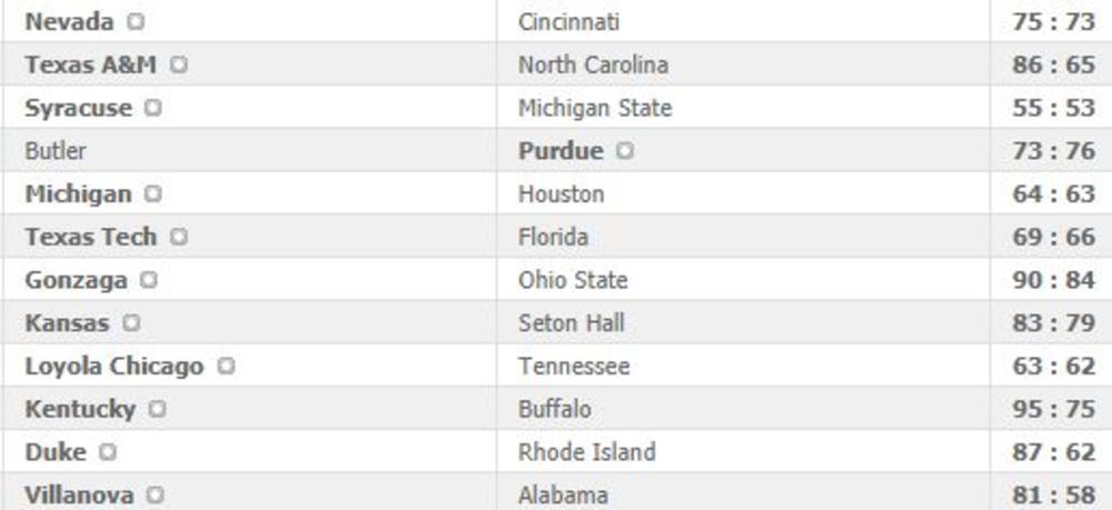 Kanzas Stejt - Kentaki Lojola Čikago - Nevada Vilanova - Zapadna Virdžinija Teksas Tek - Purdju Florida Stejt - Gonzaga Mičigen - Teksas A&M Kanzas - Klemson Sirakuza - Djuk
