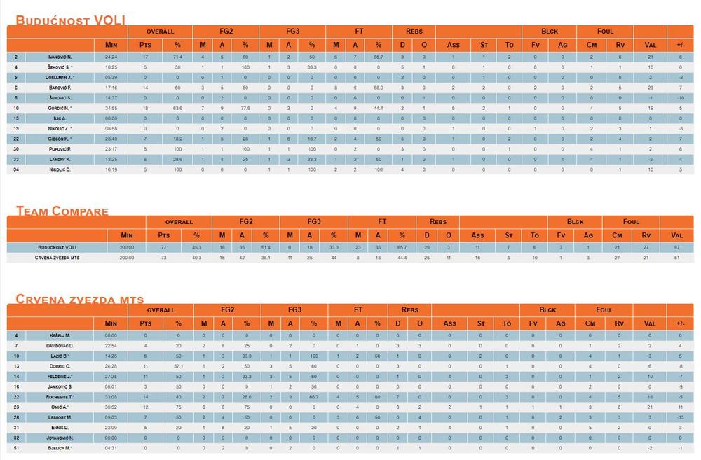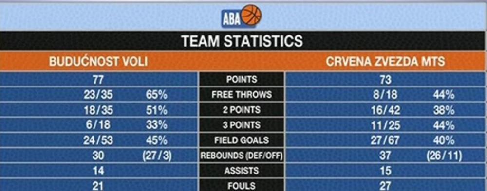 BUDUĆNOST: Ivanović 17, Šehović 5, Doelman, Barović 14, Šehović, Gordić 18, Ilić, Nikolić, Gibson 7, Popović 5, Lendri 6, Nikolić 5 CRVENA ZVEZDA: Kešelj, Davidovac 4, Lazić 6, Dobrić 11, Feldin 11, Janković 3, Ročesti 14, Omić 12, Lesor 7, Enis 5, Jovanović, Bjelica