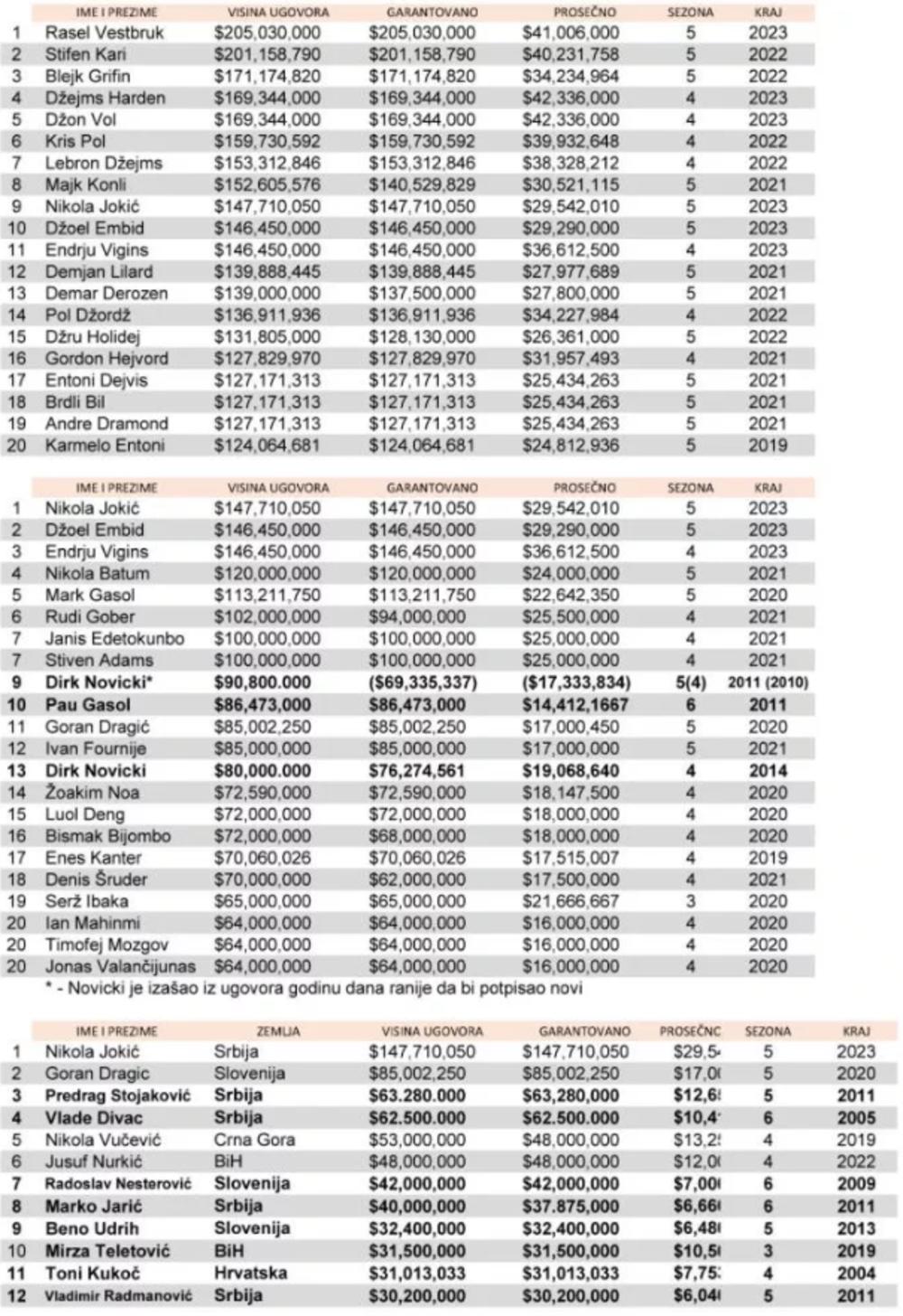 Sudeći na osnovu starta karijere, Nikola Jokić bi vrlo lako mogao da bude i nešto najbolje što se desilo NBA ligi, a došlo je sa prostora bivše SFRJ. Dok to ne dobije i „zvaničnu“ potvrdu, mladi Somborac je definitivno i vlasnik najvećeg ugovora u elitnoj ligi. Do 2023. godine prosečno će po sezoni zarađivati nešto manje od 30 miliona dolara godišnje! Naravno, pričamo sve o bruto zaradi! Bez plaćenih stanova, automobila…