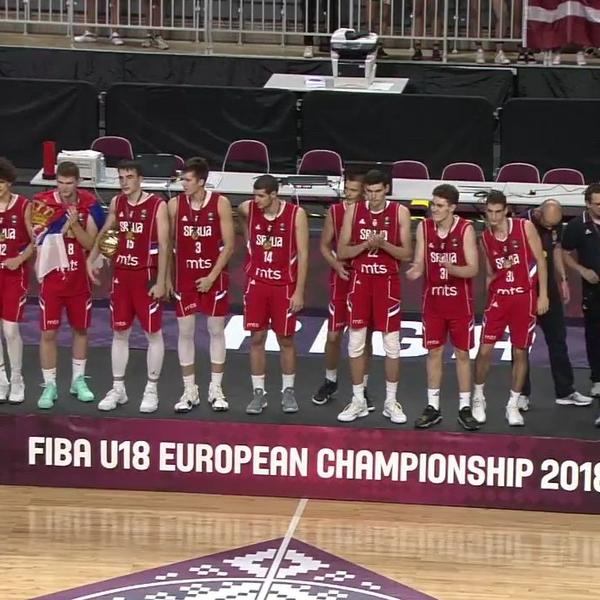 Juniorska košarkaška reprezentacija Srbije (igrači do 18 godina) postala je večeras prvak Evrope pobedom u finalu u Rigi nad Letonijom 99:90 (32:20, 22:21, 25:24, 20:25).