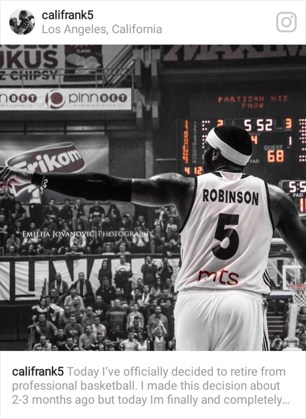 – Danas sam i zvanično odlučio da se povučem iz profesionalnog igranja košarke. Odluku sam donosio u periodu od dva do tri meseca, ali konačno mogu potpuno opušteno da kažem da sam odradio sve što sam zacrtao sebi u karijeri i da sam odigrao svoju poslednju utakmicu - oglasio se Robinson na društvenim mrežama.