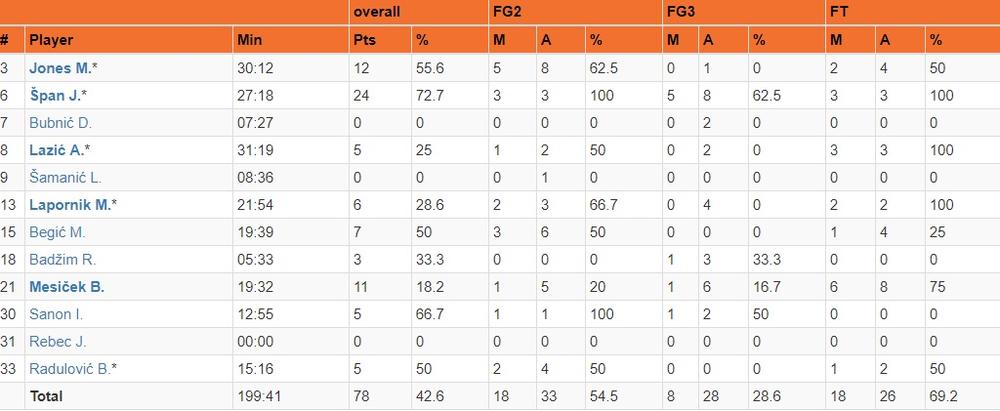 20' - Olimpija ima prednost posle prvog dela - 34:35. Pad u igri Partizana iskoristili su gosti i na krilima Špana vode na poluvremenu. Pejdž je kod domaćih ubacio 10 poena, a Zagorac 7.