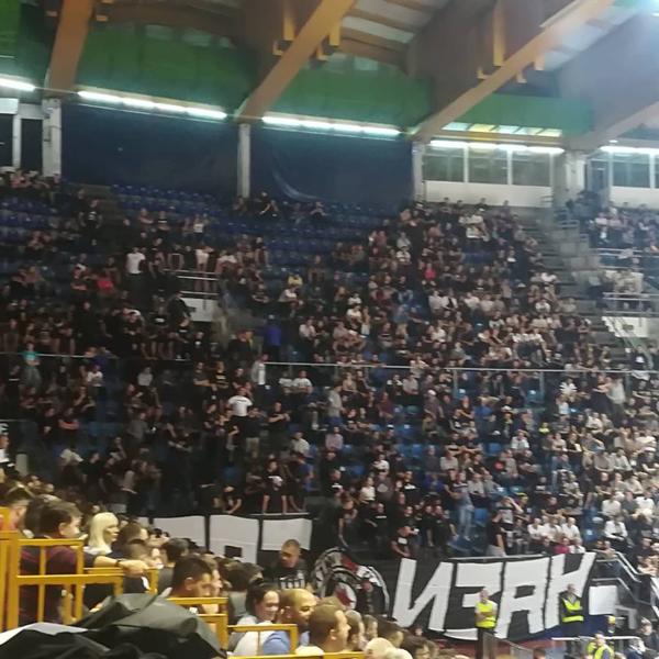 19.40 - Grobari su spremili vreo doček za Marka Simonovića, dok su igrači Partizana na zagrevanju.