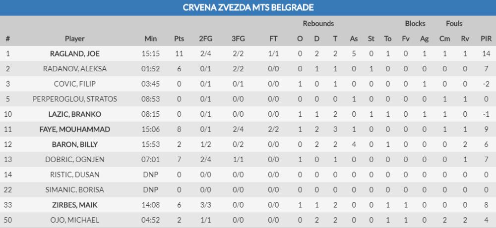 44:33 - Završeno je prvo poluvreme ovog vrlo interesantnog meča sa dosta preokreta. Prednost ima Zvezda, a ono što može da raduje je sjajna igra u finišu druge četvrtine. Sjajni Regland je ubacio 13 poena, Faje 8, Dobrić 7 i Radanov 6. Kod gostiju Jelinek je ubacio 12 koševa.