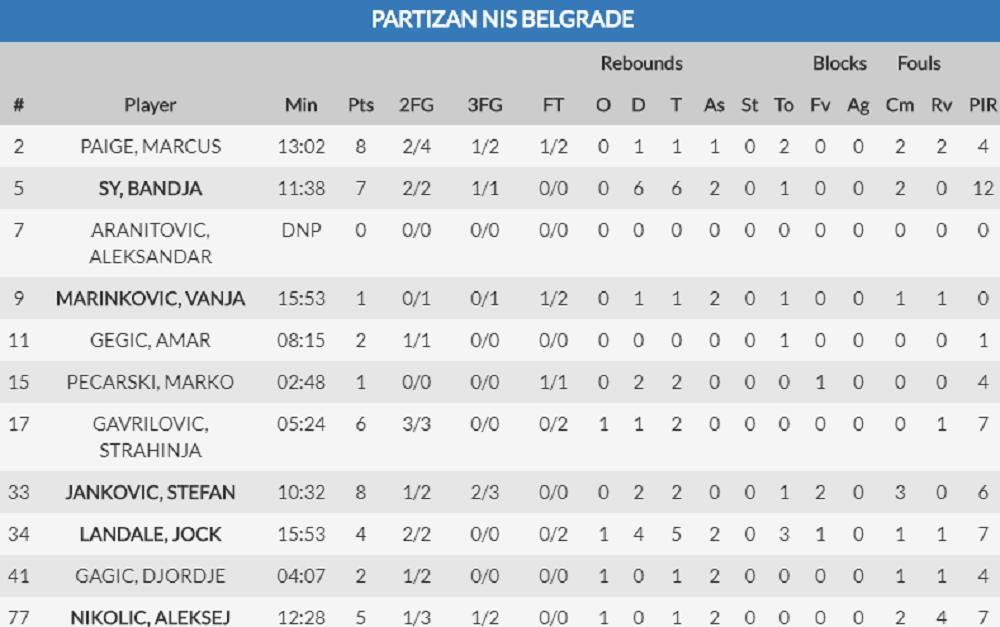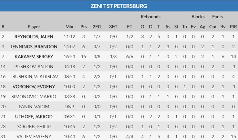 Najefikasniji na meču bio je Karašev sa 21 poenom, Kruškin i Valijev zabeležili su 10, odnosno 11 koševa, dok je u timu Partizana najefikasniji bio Vanja Marinković sa 11 poena, a Pejdž je ubacio poen manje.