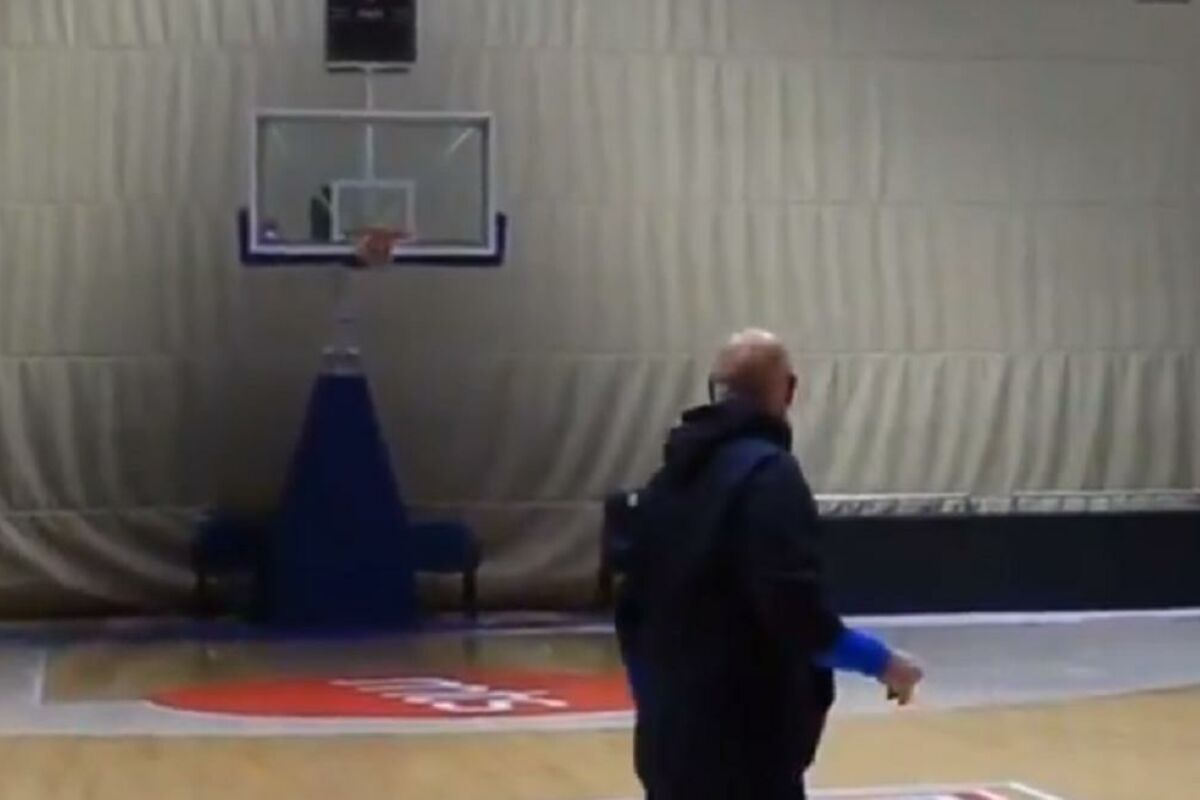 Stručnjak zadužen za fizičku spremu košarkaša tradicionalno pre treninga šutira preko celog terena, leđima okrenut obruču.