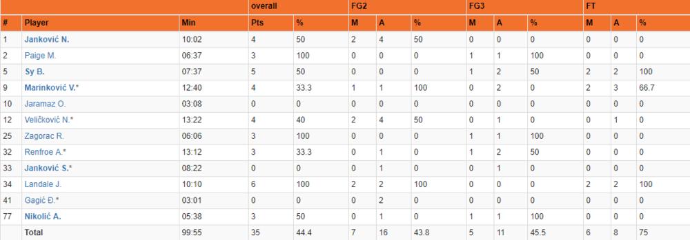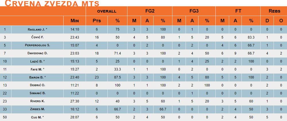 Beron je meč završio sa 23 poena, uz samo jedan promašaj (3/3 za 2, 4/5 za 3 poena, 5/5 slobodna bacanja). Davidovac je postigao 18 poena, a Filip Čović uz 16 poena imao i devet asistencija. Rivers je dodao 12 poena za Zvezdu.
