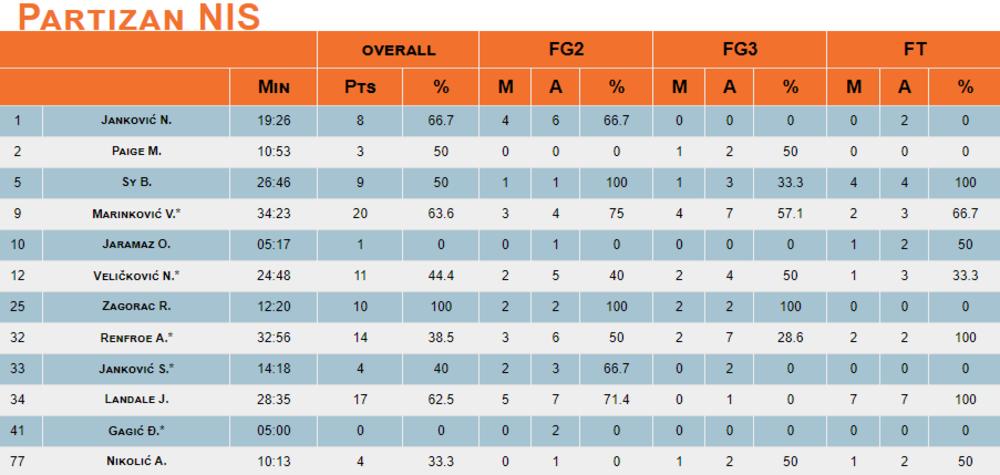 U Partizanu je najefikasniji bio Marinković sa 20 poena, Lendejl je postigao 17, Renfro 14, uz osam asistencija, a dvocifren učinak imali su još Zagorac sa 10 i Veličković sa 11 poena.