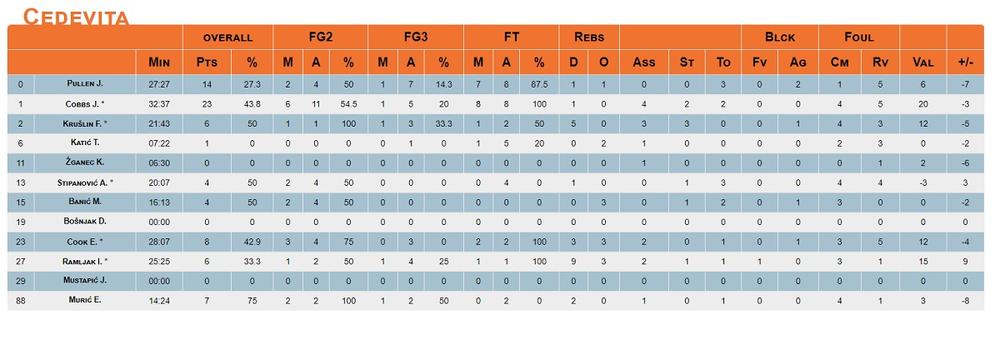 U ekipi poraženih, 23 poena imao je Džordan Kobs, dok je Džejkob Pulen dodao 14, ali uz samo jednu pogođenu trojku. Sjajan pod košem bio je Ivan Ramljak, koji je uhvatio 13 skokova, ali to je bilo nedovoljno.