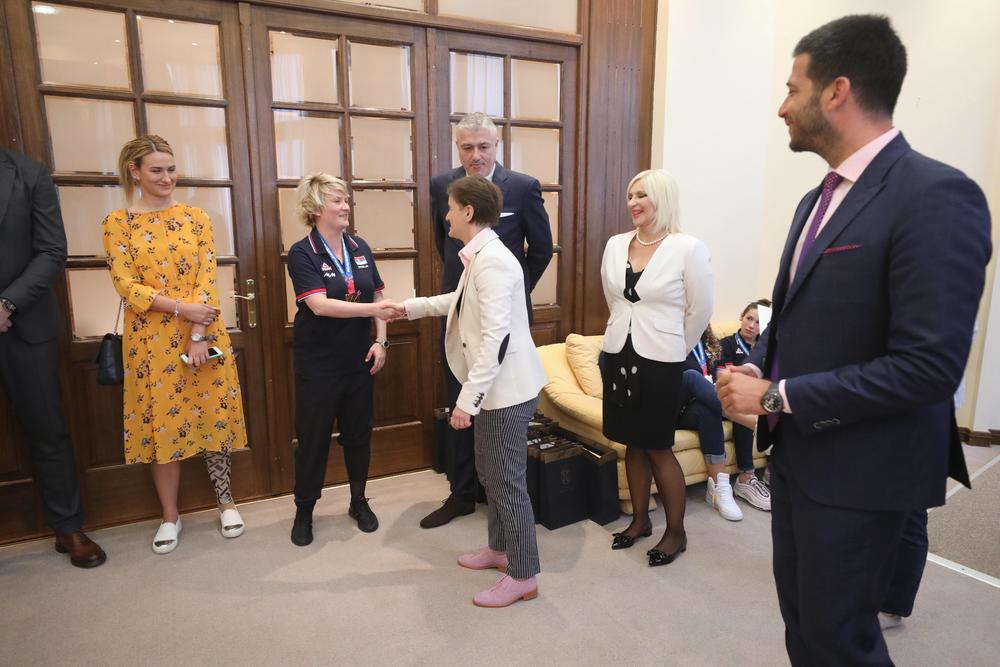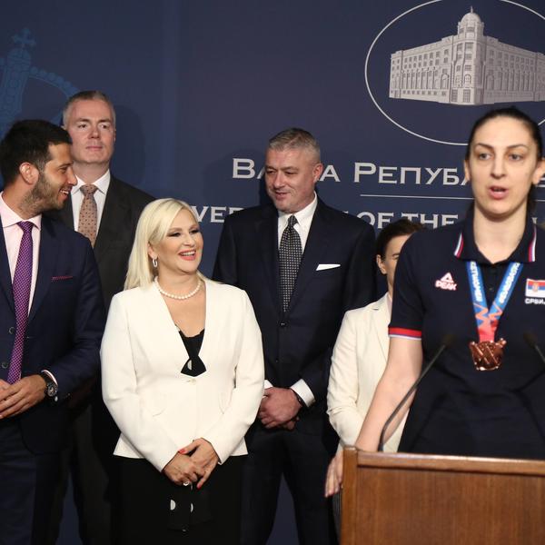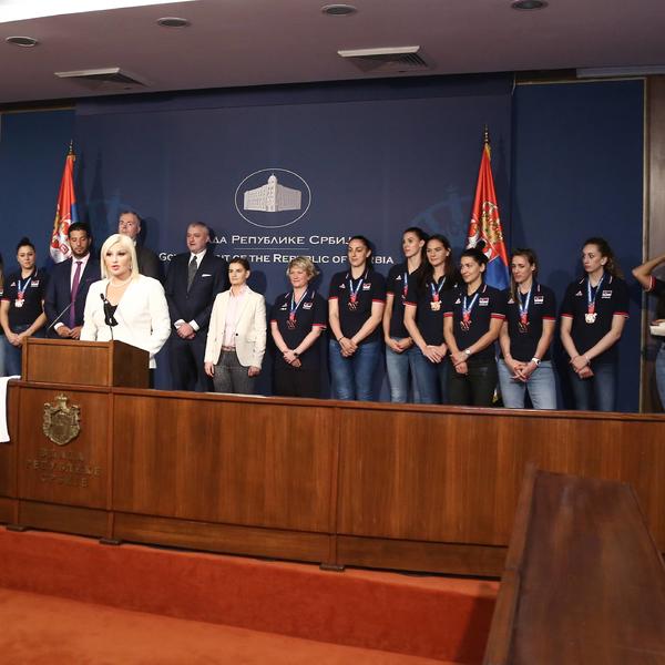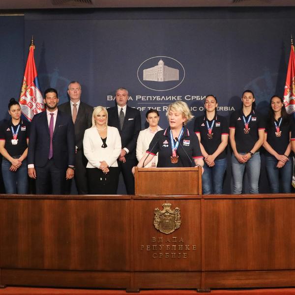 Premijerka Srbije Ana Brnabić, uz prisustvo ministra sporta Vanje Udovičića i ministarke građevinarstva, saobracaja i infrastrukture Zorane Mihajlović, primila je košarkašice Srbije, koje su na Evropskom šampionatu osvojile bronzanu medalju. - Još jednom čestitam na svemu što ste uradile. Ovo nije bilo lako, zna se koliko truda i rada stoji iza jedne medalje. Ogromno hvala. Hvala vam na radosti koju ste doneli celoj naciji. Hvala što smo se osetili ponosnim što imamo ovakav tim. Retko kad se osećamo ponosnim kao što nas naši sportisti učine - rekla je premijerka. Ona je dodala da svi možemo da učimo od sjajnih košarkašica. - Vi ste primer kako se veruje u sebe, u članove tima, kako se "gine" i nastavlja hrabro kad se poklekne. Hvala vam na svemu što nas učite. Vlada Srbije će biti tu za sve, za infrastrukturu, za nagrade, jer ste sve to zaslužili - istakla je Brnabić.