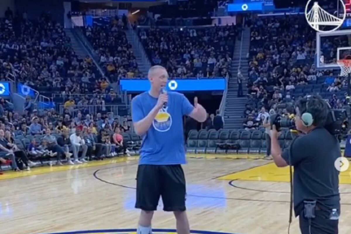 On je pred punom dvoranom uzeo mikrofon u ruke i krenuo da peva, a njegove kolege iz tima Stef Kari, Dianđelo Rasel i Drejmond Grin su u ritmu đuskali pored terena i valjali se od smeha.