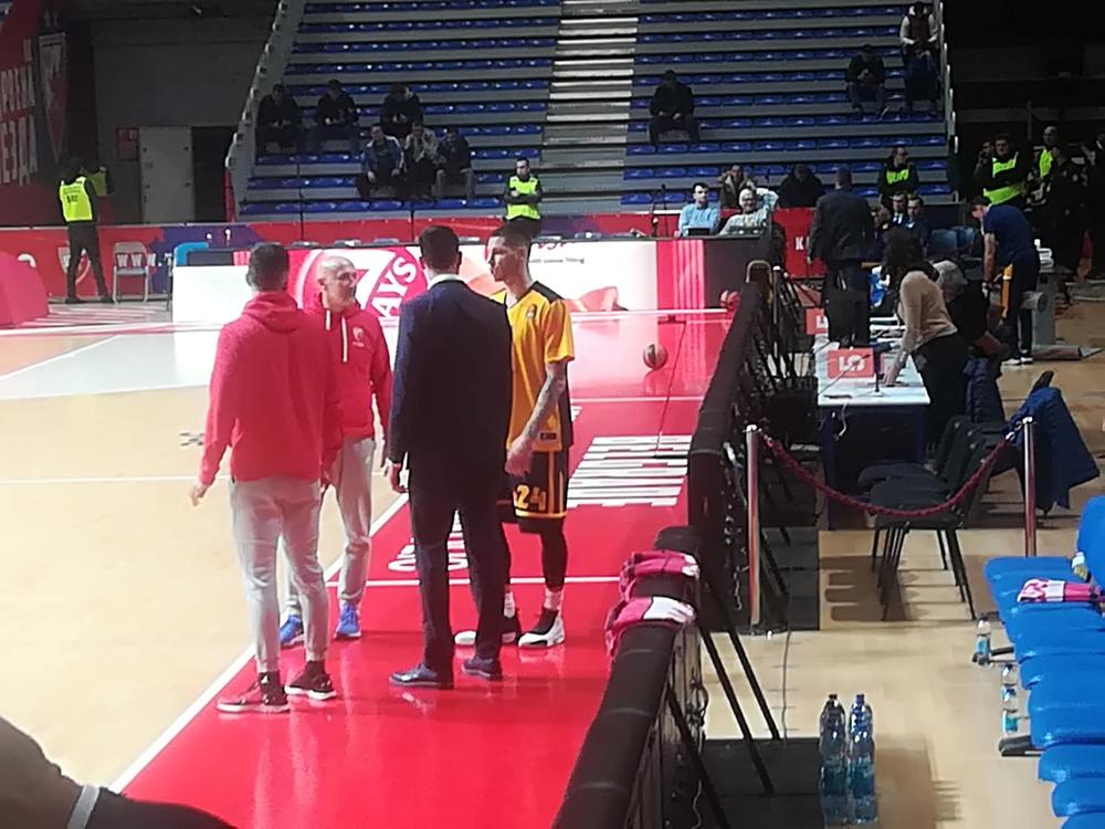 3. minut - Tima je bezobrazno udario Lazića bez lopte. Neverovatna odluka sudija. Branko Lazić je zbog duela sa Timom zaradio isključujuću ličnu grešku i neće se vraćati više na parket. Užasan početak za crveno-bele.