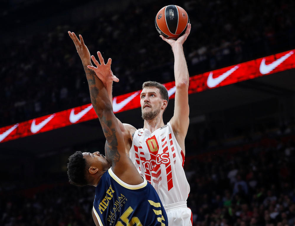 32. minut - Posle odlične odbrane Zvezde, Kozer je ipak pogodio trojku - 52:55.