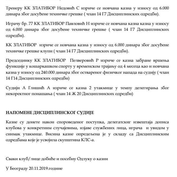 Predsedniku KK Zlatibor Rajku Pelverović izriče se kazna zabrane vršenja funkcije u košarkaškom sportu u vremenskom trajanju od 4 meseca kao i novčana kazna u iznosu od 240.000 dinara zbog ostvarenog fizičkog napada na sudiju ( član 14 G14 Disciplinskih odredbi)