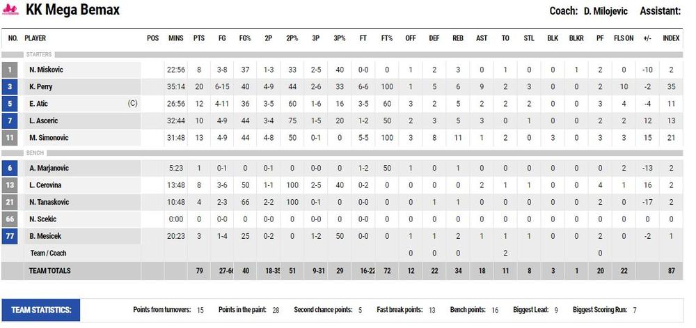 Kada je reč o Megi, najbolji je bio Peri sa 20 poena, dok je Atić postigao 12 poena.