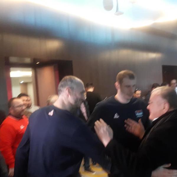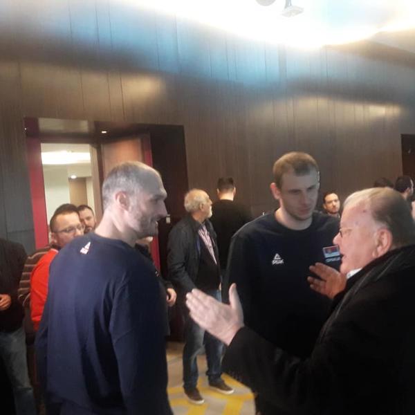 Kada su njih dvojica izašli sa ručka, odmah su prišli već pristigloj legendi naše košarke Dušanu Ivkoviću, pozdravili se sa njim, a on im je nakratko držao košarkaški "čas".