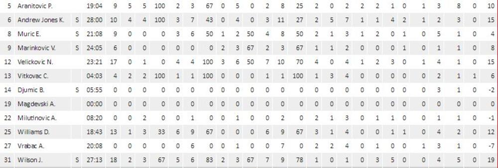 *Partizan izgleda dosta dobro na terenu, ali ne uspeva da se značajnije rezultatski odlepi. Briljira Darel Vilijams koji ima već šest ubačenih poena. Trenurno je 18:13 za crno-bele, na tri minuta do kraja prve četvrtine. *Nakon tri minuta utakmice, crno-beli vode rezultatom 6:4. Ipak, najveći utisak su već tri lične greške Božo Đumića.20:45 -