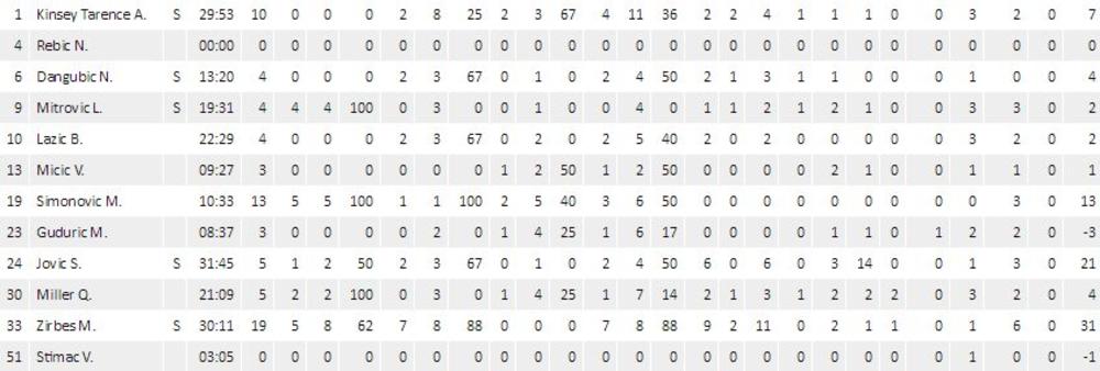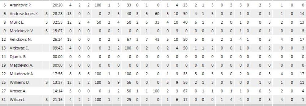 Crno-beli su nadomak pobede! Imaju 15 poena prednosti na četiri minuta do kraja!Partizan je u trenutno boljem psihološkom stanju! Crno-beli imaju prednost 59:50 na sedam i po minuta do kraja!NEVEROVATNO! Partizan ima plus šest na poslednjem dvominutnom odmoru! Adin Vrabac je pogodio trojku sa celog terena!Crvena zvezda je uspela da ponovo dođe do prednosti, ali je Partizan ponovo preokrenuo. Crno-beli imaju tri poena prednosti. U toku je poslednji minut treće deonice!Dosta se dobro igra u ovom trenutku. Darel Vilijams je postigao 12 poena u trećoj deonici. Partizan ima prednost od 2 poena. Crno-beli serijom 6:0 otvaraju drugi deo igre i dolaze do 33:29!POLUVREME - Crvena zvezda - Partizan 29:27!