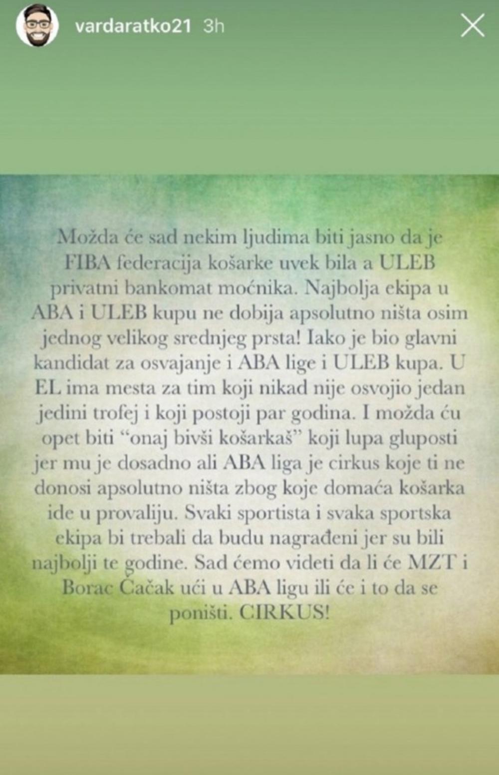 - Možda će sada nekim ljudima biti jasno da je FIBA federacija košarke uvek bila, a ULEB privatni bankomat moćnika. Najbolja ekipa u ABA i ULEB kupu (Evrokupu) ne dobija apsolutno ništa osim jednog velikog srednjeg prsta! Iako je bio glavni favorit za osvajanje i ABA lige i ULEB kupa - napisao je Varda.