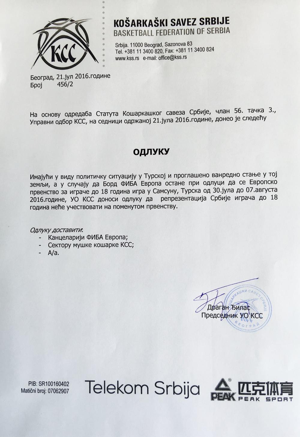 - Imajući u vidu političku situaciju u Turskoj i proglašeno vanredno stanje u toj zemlji, a u slučaju da Bord FIBA ostane pri odluci da se Evropsko prvenstvo za igrače do 18 godina igra u Samsunu od 30.7. do 7.8. UO KSS donosi odluku da reprezentacija Srbije do 18 godina neće učestvovati na pomenutom prvenstvu - piše u saopštenju na sajtu Saveza.