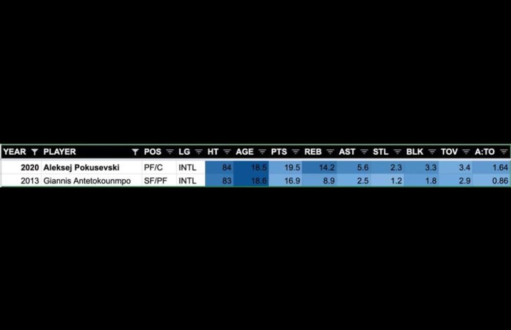 Interesantno je poređenje između srpskog centra i Janisa Adetokumba u istom uzrastu, gde se vidi da Pokuševski ima bolje statističke brojke od najboljeg defanzivca NBA lige