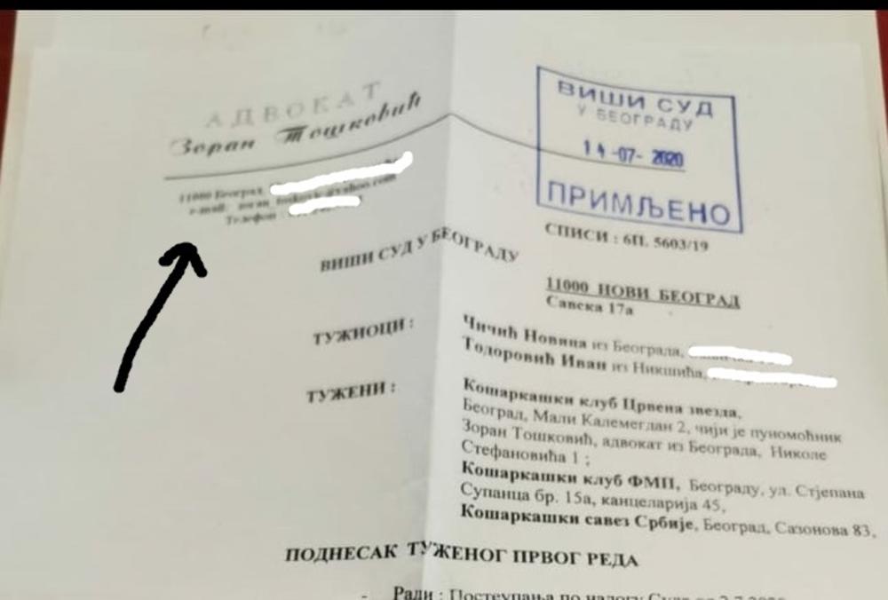 Kao jedan od dokaza, KK Partizan prezentuje podnesak sudu od strane advokata Zorana Toškovićau ime KK Crvena zvezda, a u vezi sa naplatom potraživanja od 60.000 evra nakon što je Novica Čičić na sudu dobio spor protiv porodične firme Nebojše Čovića.