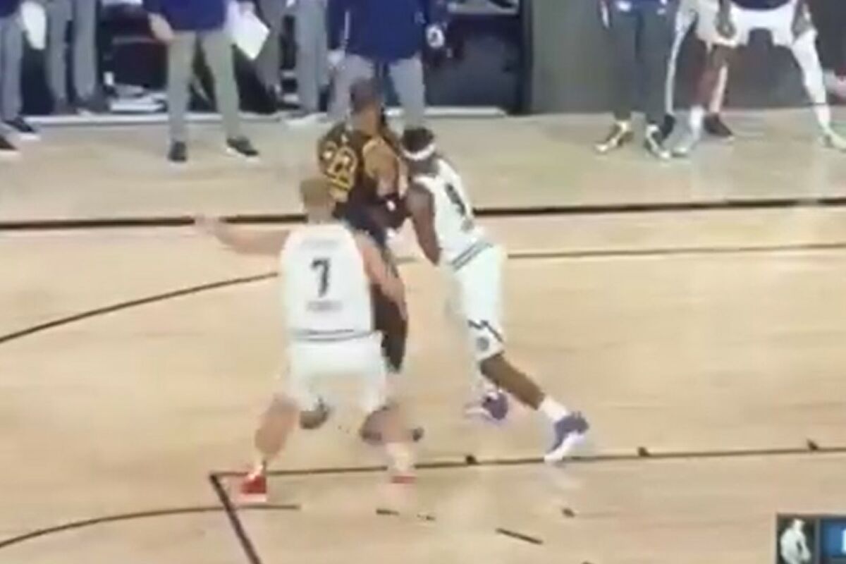 Grant, koji nije ni imao razloga za tako nešto jer je pazio na "kralja", ostao je gde je i do tada bio. Njima dvojici se tu pridružio i nesrećni Plamli, a Nikola Jokić, videvši šta se dešava, probao da nekako izblokira Dejvisa, u poslednjoj sekundi.