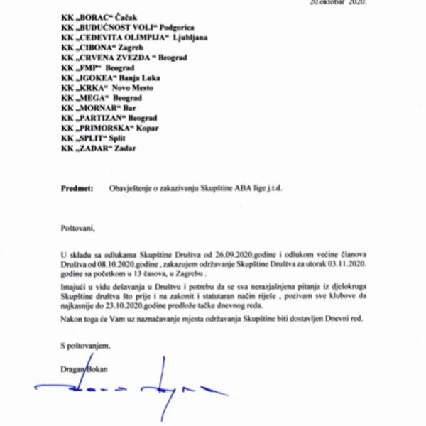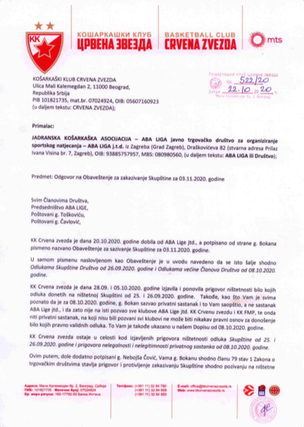 KK Crvena zvezda obaveštava javnost da je dana 20.10.2020. godine dobio poziv na sastanak, (u dopisu navedeno kao Skupština) svih klubova ABA lige jtd, koji bi trebalo da bude održan 03.11.2020. godine u Zagrebu, uz prisustvo predstavnika svih klubova.