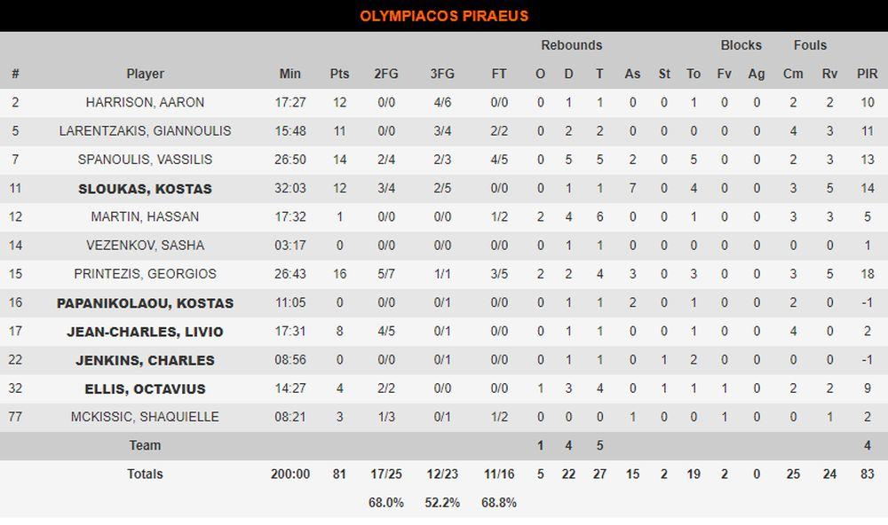 Printezis je sa 16 poena bio najefikasniji u redovima Olimpijakosa, a pratili su ga Spanulis sa 14, Slukas i Herison sa po 12 i Larencakis sa 11 poena.