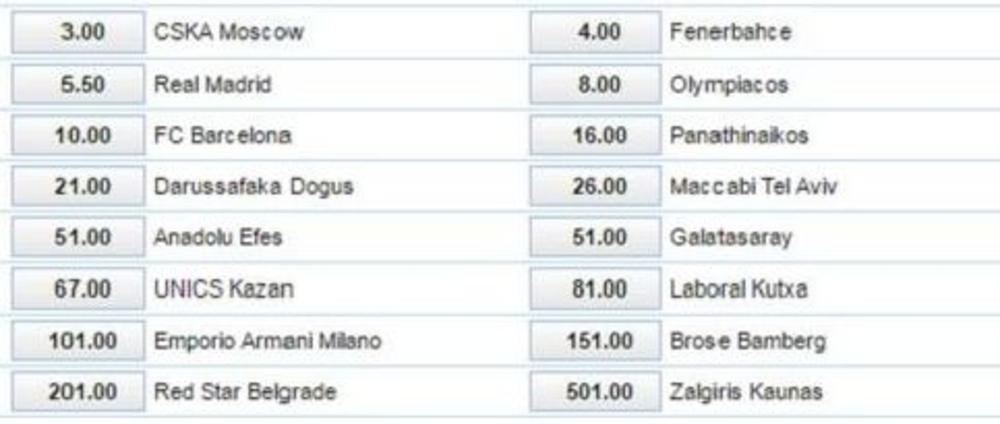 Renomirana kladionica, Vilijam Hil izbacila je kvote za osvajanje Evrolige, a sudeći prema ponudi, čini se da svi smatraju da će Crvena zvezda imati samo epizodnu ulogu u elitnom takmičenju.