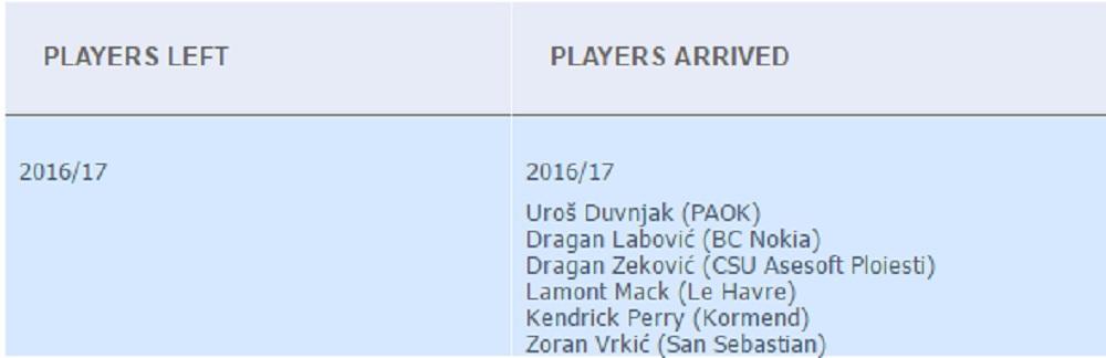 Nijedan važan igrač nije napustio klub, a čak šest ga je pojačalo - Uroš Duvnjak, Dragan Labović, Dragan Zeković, Lamont Mek, Kentrik Peri i Zoran Vrkić.
