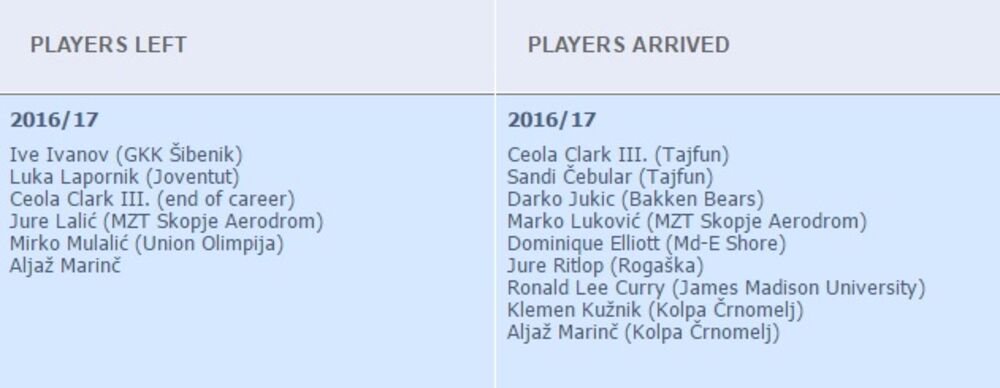 Otišlo je svega šest igrača, a stigli su Sandi Čebular, Darko Jukić, Marko Luković, Dominik Eliot, Jure Ritlop, Ronald Li Kari, Klemen Kužnik i Aljaž Marinč. Možda će se najviše očekivati od američkih igrača, posebno od Karija, koji je došao sa Džejms Medison Univerziteta!